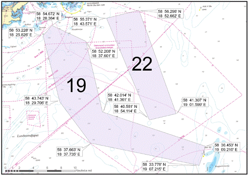 Kvarliggande minor från svenska och utländska mineringar kan förekomma på markerade områden nedan. Förhöjd risk vid ankring, trålning och andra bottenaktiviteter.